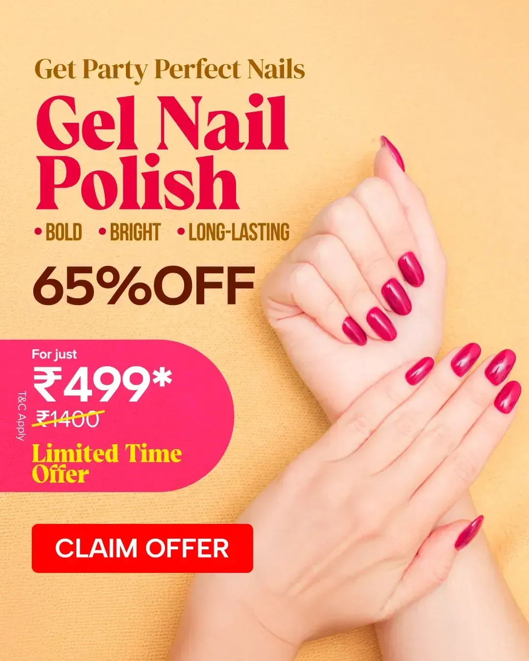 For all the women's, Premium gel nail polish using Bluesky, applied by experienced stylists, with personalized color suggestions. Get Gel Nail Polish for the most beautiful nails that will make you stand out. Book now and get this amazing service for @ 65% Off now only ₹499*(Retail Value: ₹1400*)